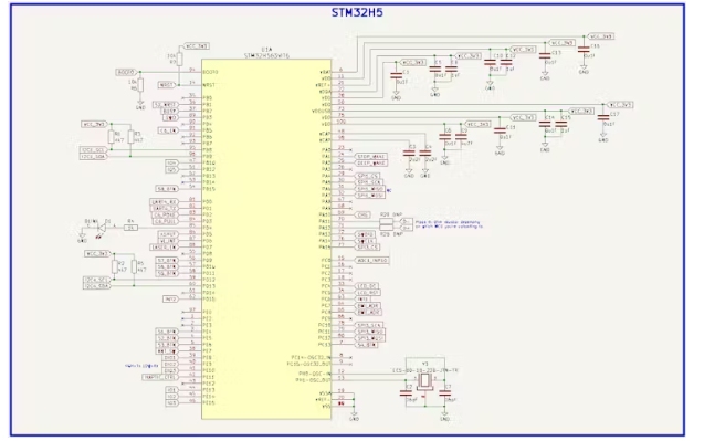 要設置STM32H563或任何MCU,您應該首先查看數(shù)據(jù)表。從那里,您可以導航到電源部分,找出哪里需要哪種去耦電容器,然后進入晶體規(guī)格頁面。在我的情況下,一個8MHz晶體工作得很好,因為它在建議的范圍內。除此之外,我還在I2C線路上添加了一些上拉電阻(必需的),并在BOOT和RST引腳上添加了所需的上拉/下拉電阻,以確定默認啟動狀態(tài)。USB引腳上的0歐姆電阻只有在上傳到STM32時才能放置,因為USB也與ESP32-C6共享。