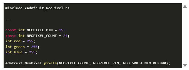 好了,現(xiàn)在我們已經(jīng)有了基本的概念,讓我們更新音頻錄制代碼來處理函數(shù)調(diào)用!讓我們首先將Adafruit NeoPixel庫添加到類的頂部,以及定義LED環(huán)使用的引腳,該環(huán)上有多少NeoPixels,以及LED使用的紅/綠/藍(lán)顏色的一些默認(rèn)值。我們還需要定義neoppixel控制器對象。