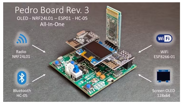 Pedro提供多種無線通信選項,其集成的nRF24L01模塊用于遠程控制,HC-05藍牙模塊用于智能手機連接,ESP8266 WiFi模塊用于物聯(lián)網(wǎng)集成。它還具有一個128x64的OLED顯示屏,允許實時反饋和數(shù)據(jù)可視化。