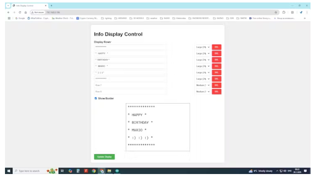 需要顯示的文本分為8個(gè)字段。在每一行中,我們可以選擇提供的三種字體大小中的一種,旁邊是一個(gè)用于刪除該行內(nèi)容的按鈕。下面是一個(gè)字段,我們可以直觀地看到寫在黑板上的文字將是什么樣子。底部是一個(gè)綠色的更新按鈕,通過它我們可以通過Wi-Fi網(wǎng)絡(luò)將內(nèi)容傳輸?shù)诫娐钒迳?。在屏幕頂部的兩個(gè)按鈕上,我們可以選擇黑色背景上的白色文本,或者白色背景上的黑色文本。