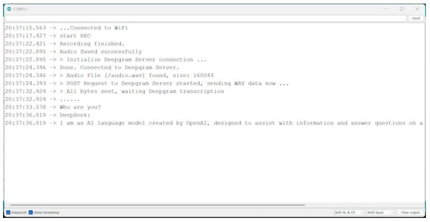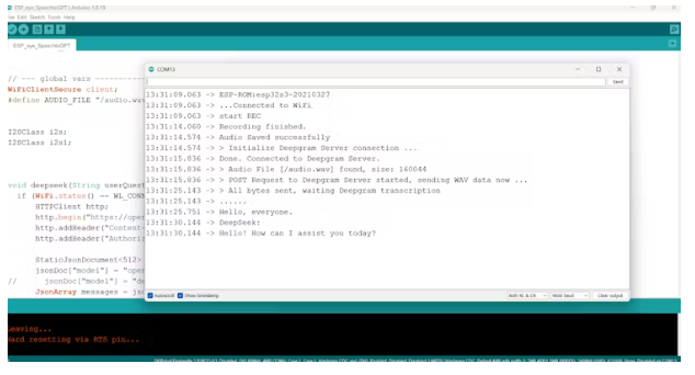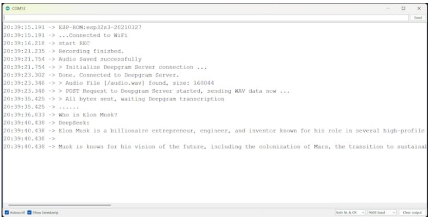 首先,它將連接到網(wǎng)絡(luò),然后它將錄制5秒的音頻。然后它會(huì)使用deepGram將音頻轉(zhuǎn)換為文本,然后它會(huì)向OpenAI或DeepSeek查詢。