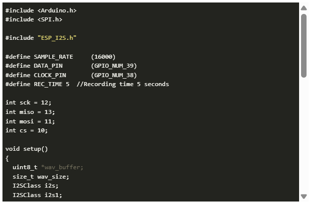 下面的草圖可以錄制5秒的音頻,然后它也會(huì)將其保存為。wav文件在SD卡上,它通過(guò)內(nèi)置揚(yáng)聲器播放音頻。
