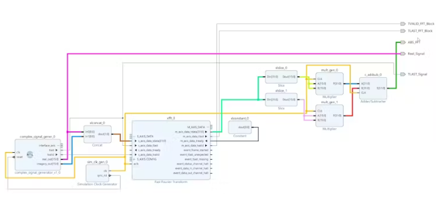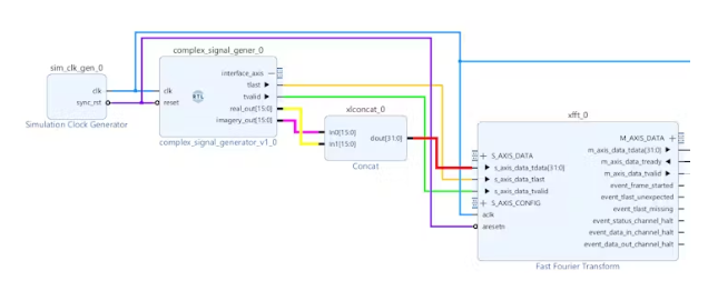 將信號發(fā)生器模塊的Tlast和Tvalid信號連接到FFT IP塊的Tlast和Tvalid輸入端。這確保了適當(dāng)?shù)耐?,并為AXI流協(xié)議提供了必要的控制信號。
