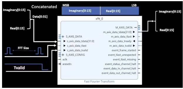 該圖說明了使用axis - stream接口的FFT IP核的輸入和輸出數(shù)據(jù)格式。FFT處理復(fù)雜數(shù)據(jù),其中每個樣本由16位實部和16位虛部組成。這些組件被連接成一個32位數(shù)據(jù)字,虛數(shù)部分占據(jù)最高有效位16位,實數(shù)部分占據(jù)最低有效位16位。
