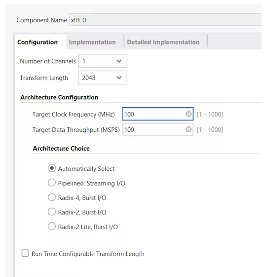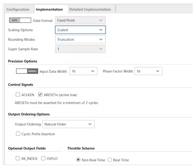 接下來,轉(zhuǎn)到Implementation選項卡并將輸入數(shù)據(jù)寬度設(shè)置為16位。對于相位因子寬度,您可以將其保留在16位,或者如果您在FFT變換中需要更高的精度,可以選擇更高的值。