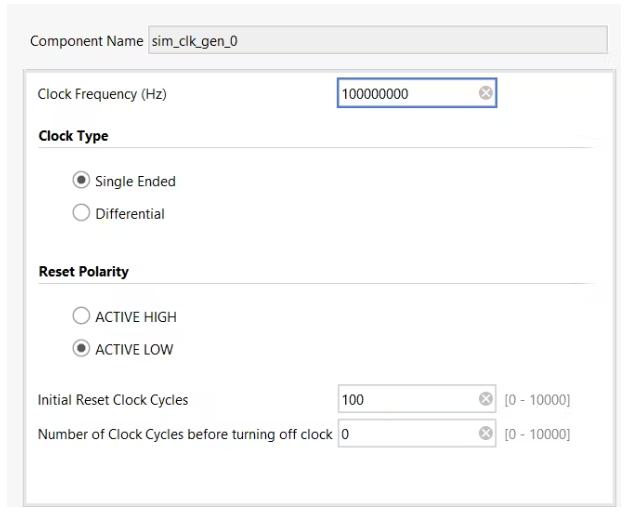 在您的設(shè)計中添加一個模擬時鐘生成器,并將其時鐘頻率設(shè)置為與您為FFT IP塊選擇的目標(biāo)頻率匹配。這確保了仿真在正確的時間運行,并與FFT處理要求保持一致。然后我們將使用這個時鐘來運行模擬中的所有ip。