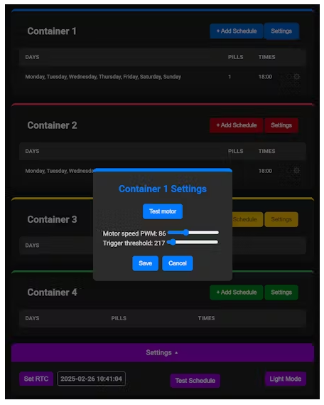 最后一個大的改變,可能也是我花了最長時間來實現(xiàn)的,就是增加一個便于調(diào)度的web界面。在整個項目中,藥丸分配器的設(shè)置是硬編碼的,這對大多數(shù)愛好者來說是可以接受的。那些給視頻發(fā)郵件、發(fā)信息和評論的人知道如何把東西放在一起,但不知道如何編寫程序。所以我終于強(qiáng)迫自己把它做好了。信不信由你,這并不像看起來那么難,尤其是現(xiàn)在AI已經(jīng)和它的編程能力一樣好了。整個過程只花了幾天時間就達(dá)到了拋光狀態(tài),我甚至添加了一個黑暗模式。