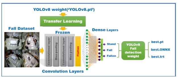 下圖說(shuō)明了跌落檢測(cè)架構(gòu)。它包括通過(guò)凍結(jié)某些層的權(quán)重來(lái)微調(diào)預(yù)訓(xùn)練的YOLOv8模型,并將輸出通過(guò)密集層進(jìn)行墜落運(yùn)動(dòng)分類(lèi)。