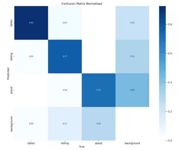 評(píng)估結(jié)果表明,平均精密度(mAP)為94%,精密度為90%,召回率為91.9%。這些圖提供了我們的模型性能的可視化,說(shuō)明了它在通過(guò)訓(xùn)練結(jié)果圖和混淆矩陣檢測(cè)跌倒方面的魯棒性。