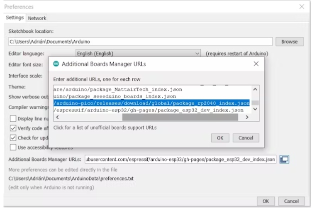 2. 在首選項(xiàng)中,我們將添加您可以在這里找到的其他板的URL。我們需要Earlephilhower的Arduino-Pico