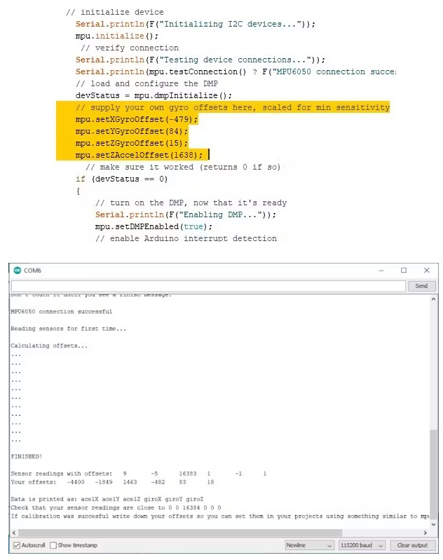 現(xiàn)在是有趣的部分,即為我們構(gòu)建的設(shè)備定制代碼。根據(jù)組件的布局,機(jī)器人的重心會發(fā)生變化,而且每個(gè)MPU6050板都有最小的差異,需要在部分代碼中進(jìn)行補(bǔ)償。如果我們更詳細(xì)地看一下代碼,我們會看到有一個(gè)地方是設(shè)置陀螺儀偏移量的。