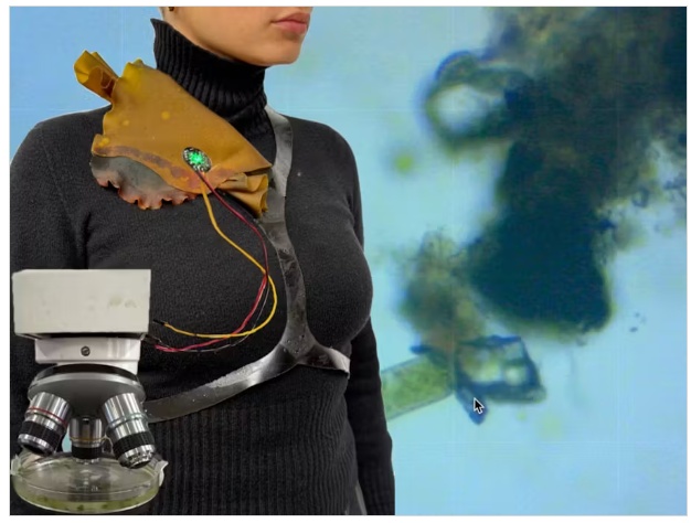 這個概念是設(shè)計一件環(huán)繞脖子和胸部的衣服,吸引像魚/藻類一樣的概念,允許生物材料將傳感器固定在脖子上,同時提出人類與生活在水中的生物的雜交。