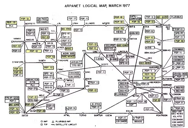1977年3月阿帕網(wǎng)的所有pdp -10都用黃色標(biāo)記。由于IMP包含在PiDP-10模擬器中,因此正在計(jì)劃用一組PiDP-10和-11重新創(chuàng)建這個(gè)早期的阿帕網(wǎng)快照。