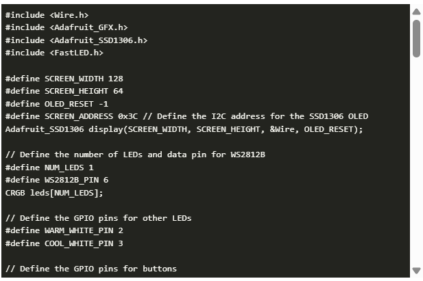 這些led是用按鈕控制的,可以進(jìn)行交互式照明調(diào)節(jié)。FastLED庫(kù)控制WS2812B RGB LED,而Adafruit SSD1306庫(kù)管理OLED顯示器。