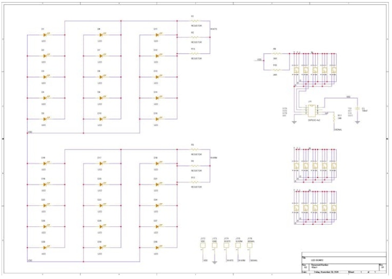 同樣,所有暖白光led并聯(lián)連接,陽(yáng)極連接到VCC,陰極通過(guò)標(biāo)記為暖的CON 1端子串聯(lián)到三個(gè)電阻。