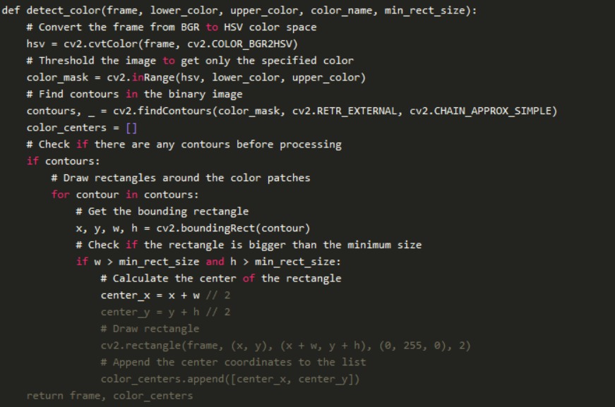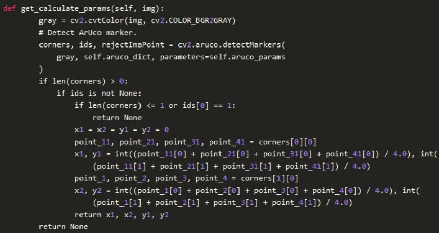 該函數(shù)識別圖像中的2個ArUco標(biāo)記,并計算每個標(biāo)記的中心坐標(biāo)(X, Y)。然后返回得到的X和Y坐標(biāo)以供進一步使用,例如坐標(biāo)轉(zhuǎn)換、相機校準(zhǔn)或機器人定位。
