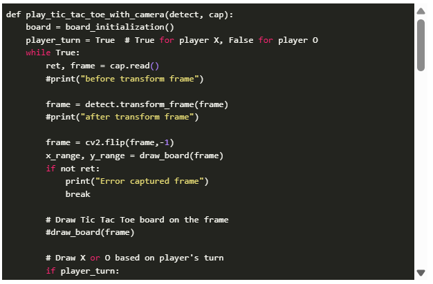 這部分代碼使用計算機視覺實現(xiàn)了一個實時井字游戲。這款游戲涉及人類玩家和AI。它與攝像機交互,處理幀以檢測移動,并相應(yīng)地更新游戲板。
