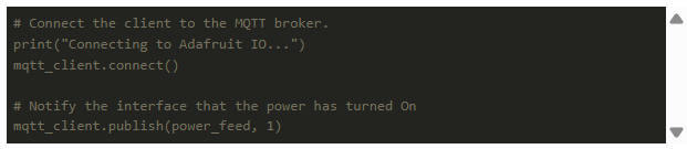 只需使用MQTT.connect()函數(shù)連接到服務(wù)器,這將同時(shí)觸發(fā)我們前面定義的MQTT.connected()函數(shù)。同時(shí),我們將值1發(fā)布到Adafruit IO,以將電源開(kāi)關(guān)更改為On狀態(tài)。