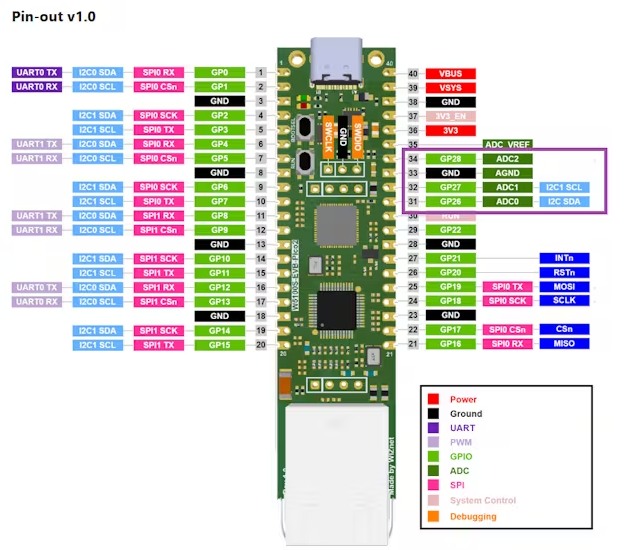 旁注:在W5100S-EVB-Pico 2中,有用于模擬信號(hào)和數(shù)字信號(hào)的端口。您可以參考以下圖片或訪問(wèn)Wiznet的官方網(wǎng)站來(lái)查找ADC端口