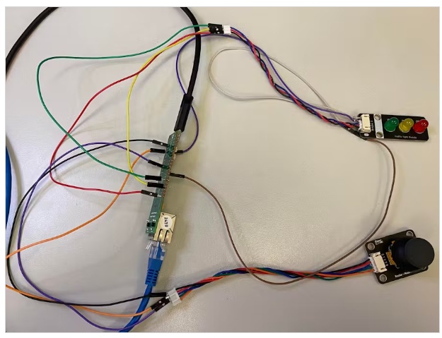根據(jù)連接圖,我將搖臂模塊的垂直組件連接到GP26上,綠、黃、紅燈分別連接到GP11、13、15上。