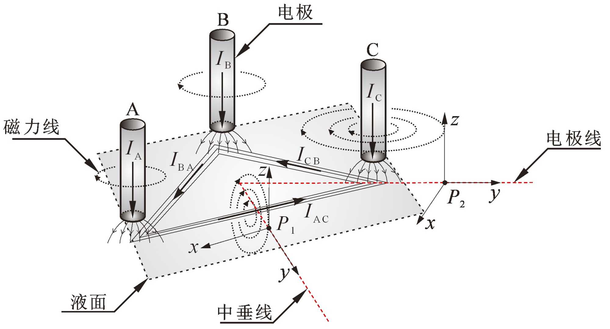 在圖1中,IA、IB、IC分別表示通過電極的電流,而IAC、ICB、IBA分別表示熔池中的回路電流。