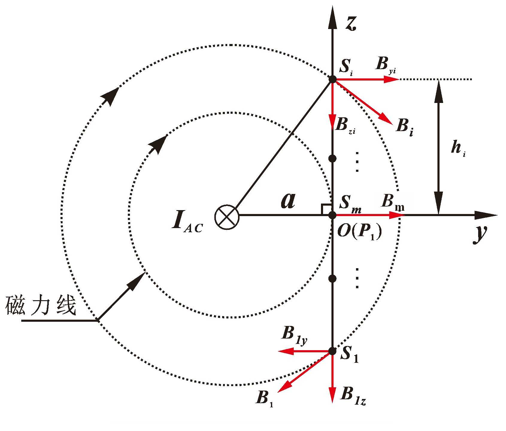 將圖1中的檢測點(diǎn)P1設(shè)定為坐標(biāo)原點(diǎn)O,并在z軸上選擇(S1, S2, …, Sm, …, Si)作為監(jiān)測點(diǎn)。當(dāng)僅考慮電流IAC對磁場的貢獻(xiàn)時(shí),則中垂線上的磁場分布特征如圖3所示。