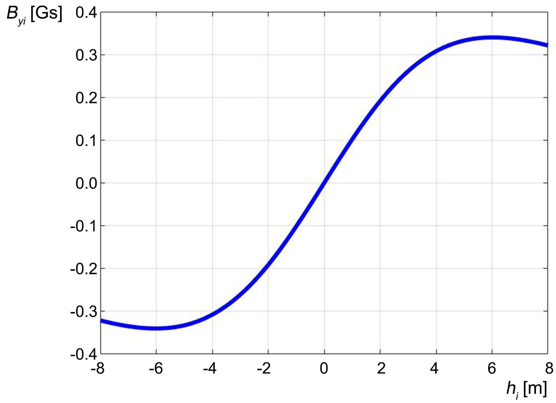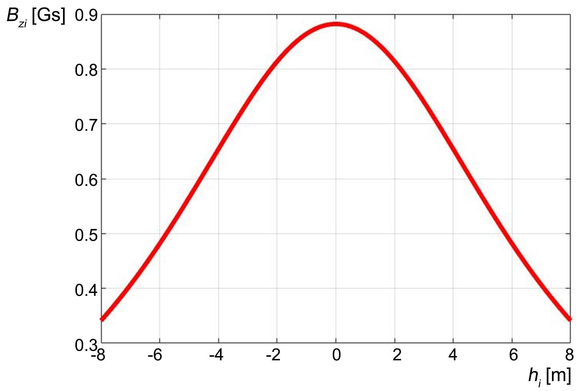 從圖4可觀察到,在hi的取值范圍為?10~10 m之間,中垂線上某點(diǎn)的磁感應(yīng)強(qiáng)度Byi表現(xiàn)為奇函數(shù)特性,而Bzi表現(xiàn)為偶函數(shù)特性。hi-Byi曲線的零點(diǎn)與hi-Bzi曲線的峰值點(diǎn)均對應(yīng)于礦熱爐的電極端部位置。因此,從該中垂線上的檢測點(diǎn)進(jìn)行觀測,Byi與Bzi包含了電極端部位置等相關(guān)信息。