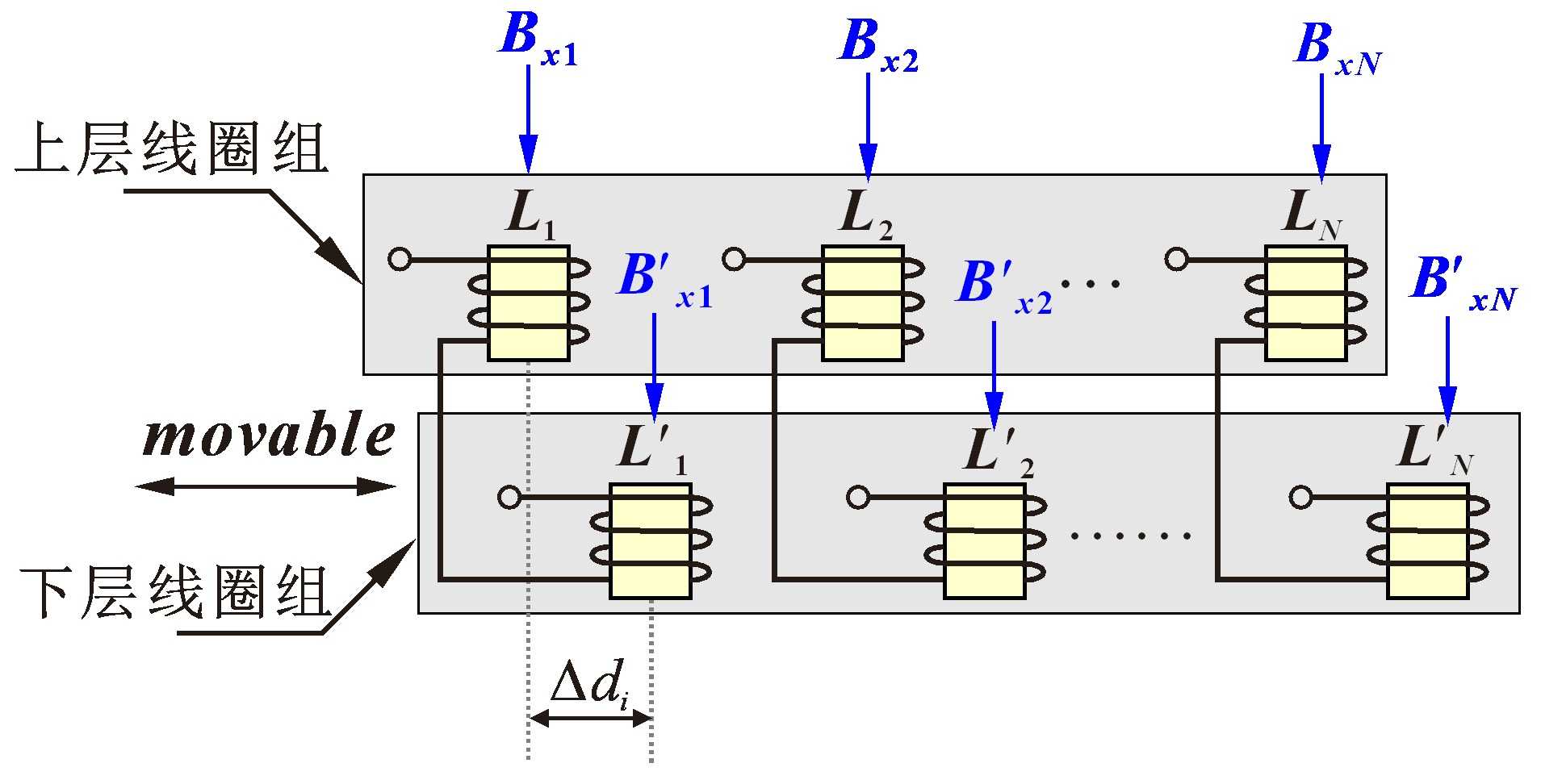 由圖10可知,上下兩組線圈按順序依次進(jìn)行差動,上層線圈組的位置不變,下層線圈組的位置可靈活調(diào)整,因此,兩差動線圈的間距Δd是可變的。