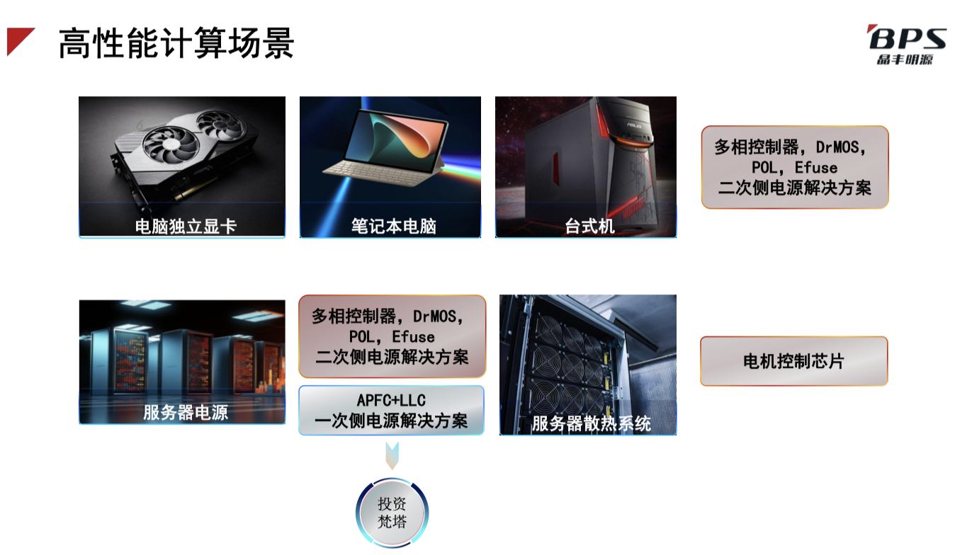 上市后,晶豐明源在ACDC電源領(lǐng)域持續(xù)深耕,同時將目光投向電機控制和高性能計算等新興場景。例如,2022年投資的BMS(電池管理系統(tǒng))公司在2024年實現(xiàn)量產(chǎn),收入達到百萬級;2024年底投資的數(shù)字APFC+LLC公司,則為大功率照明和黑電領(lǐng)域提供了技術(shù)支持。此外,公司斥資近10億元打造高性能計算場景,2024年成功進入英偉達50顯卡參考設(shè)計,成為全球唯三、國內(nèi)唯一的設(shè)計方案,并與飛騰、海光、龍芯等國產(chǎn)芯片廠商建立合作。這種從家庭到計算、終端和出行的多場景布局,正是并購戰(zhàn)略的成果。
