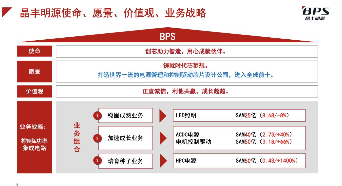 晶豐明源成立于2008年,起初專注于LED照明領(lǐng)域,憑借技術(shù)積累和市場洞察,迅速在家庭、辦公和商業(yè)照明市場占據(jù)了一席之地。胡黎強提到,公司在LED照明控制技術(shù)上擁有深厚積累,市場份額一度達到30%以上。然而,即便占據(jù)了如此高的份額,其市場規(guī)模仍受限于50億元人民幣,無法支撐公司更宏大的愿景——打造世界一流的電源管理和控制驅(qū)動芯片設(shè)計公司,進入全球前十。