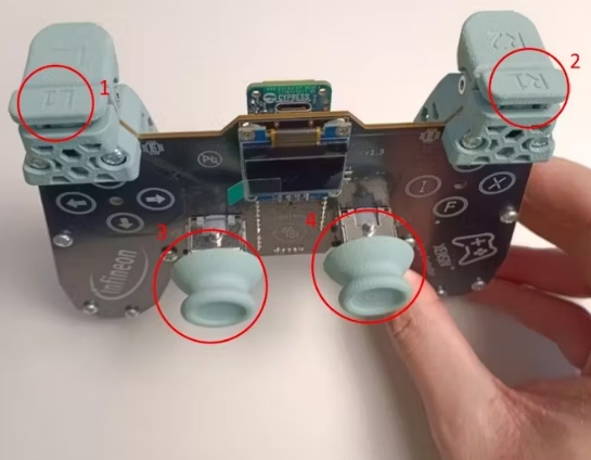 連接建立成功后,CYW920829M2EVK-02開始發(fā)送報(bào)文。當(dāng)KIT_XMC71_EVK_LITE_V1開始接收這些數(shù)據(jù)包時(shí),顯示將更改為顯示標(biāo)題屏幕。該屏幕將顯示英飛凌徽標(biāo)和參與創(chuàng)建XMC71_EVK_DisplayAdapter_V11自定義板的合作伙伴公司的徽標(biāo)。幾秒鐘后,演示將開始。我們將首先描述控制器按鈕的Xbox名稱,并將XENSIV放在括號(hào)中。每個(gè)控制器中功能相同的按鈕在上面的控制器圖中編號(hào)相同。