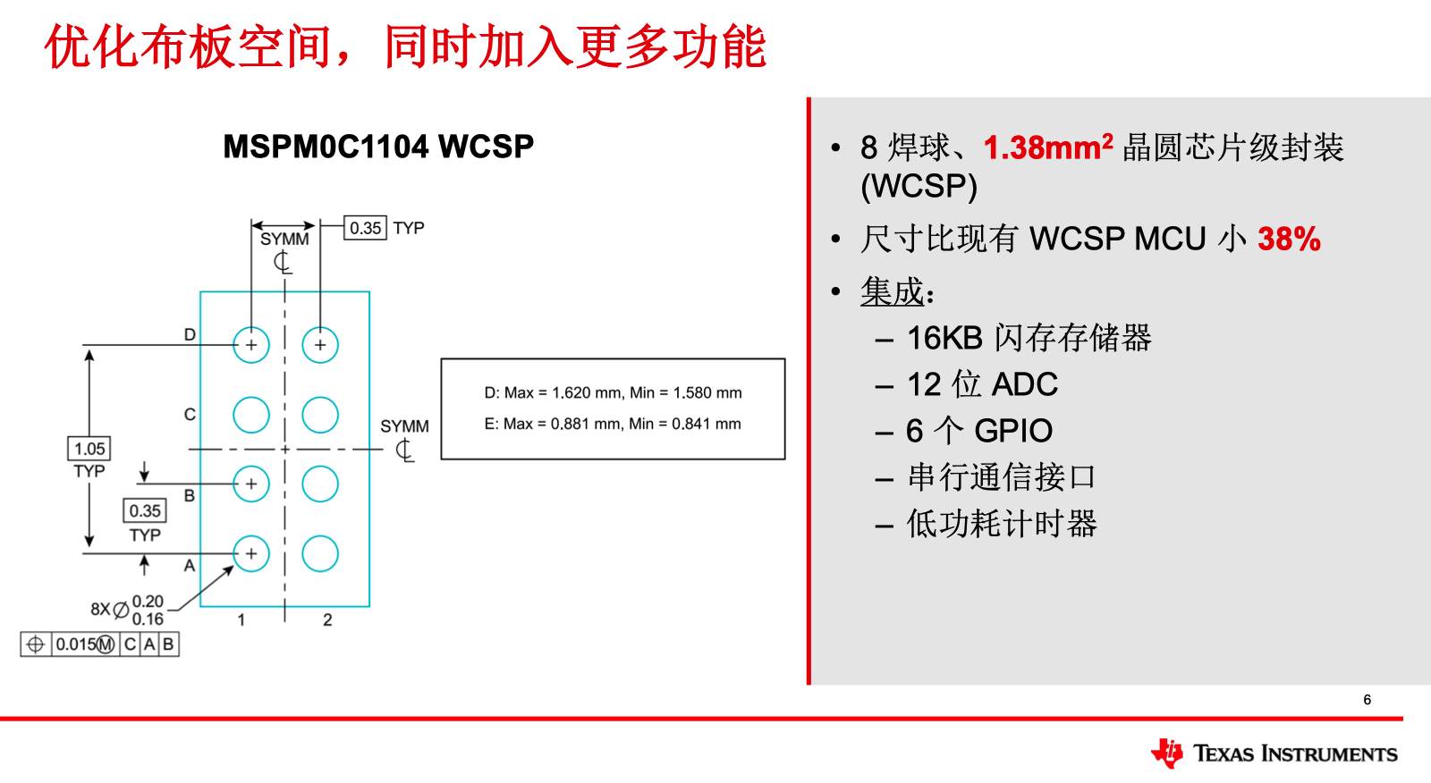 MSPM0C1104采用8焊球WCSP封裝,尺寸僅為1.38平方毫米,較業(yè)內(nèi)同類產(chǎn)品縮小了38%。這一突破得益于TI在封裝技術(shù)上的深厚積累。WCSP(Wafer-Level Chip-Scale Package)技術(shù)通過在晶圓級(jí)直接完成布線和焊球布局,省去了傳統(tǒng)封裝的外部塑封工藝,不僅大幅縮小了封裝體積,還降低了生產(chǎn)成本。Yiding在回答媒體提問時(shí)提到,TI在多條產(chǎn)品線的量產(chǎn)經(jīng)驗(yàn)中不斷優(yōu)化WCSP技術(shù),最終實(shí)現(xiàn)了這一超小型封裝的量產(chǎn)突破。