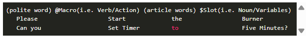 如果語音識別模型能夠檢測到各種具有相同意圖的人類短語,那么它將會更好地工作。正確列出宏元素和更好的表達是成功的關(guān)鍵。