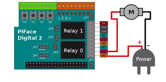 電機(jī)和電源應(yīng)按如下方式連接到PiFace數(shù)字2的繼電器0上: