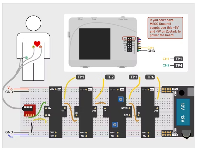 模塊互連:按順序連接模塊-首先捕獲心電信號,然后分階段過濾掉不需要的頻率。每個模塊的輸出直接饋送到下一階段,確保干凈的信號路徑。