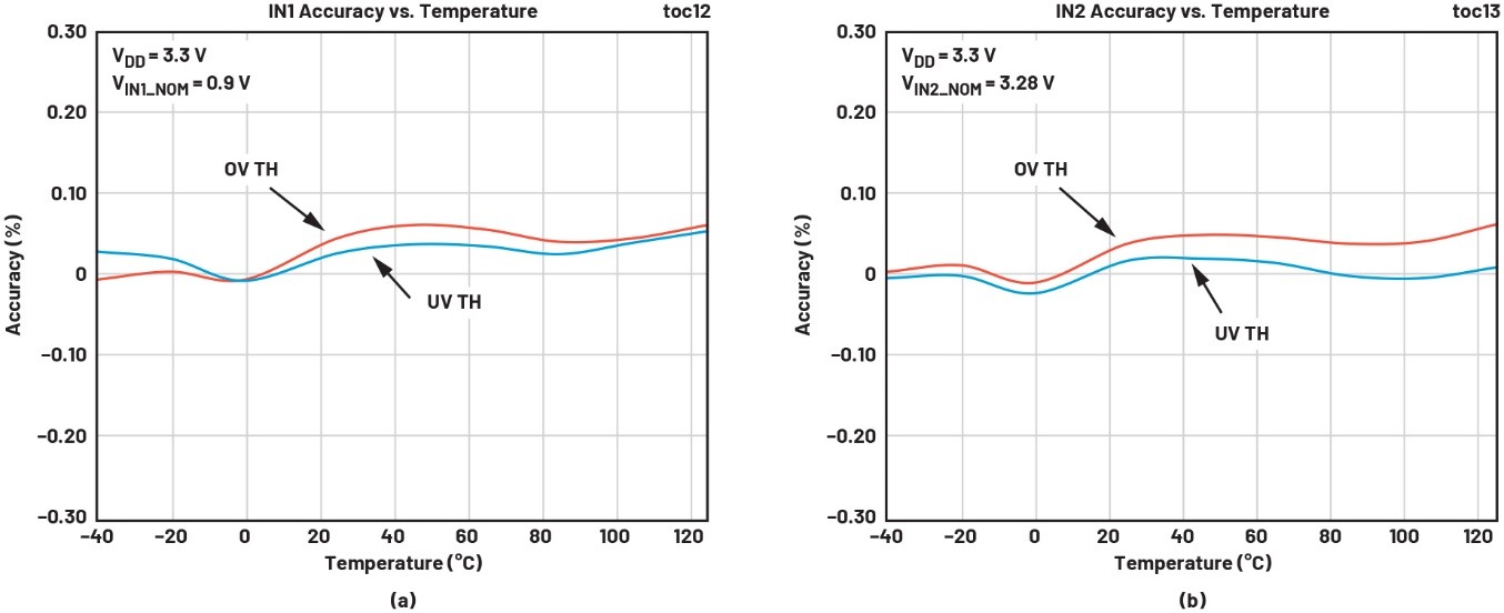 MAX16193的閾值精度在整個工作溫度范圍(-40℃至+125℃)內(nèi)均保持穩(wěn)定。圖8a和圖8b表明,對于IN1和IN2兩個輸入,該器件的高閾值精度在不同溫度下均表現(xiàn)出色。與其他電壓監(jiān)控器僅在特定范圍內(nèi)表現(xiàn)出最優(yōu)性能不同,該器件在從最低到最高工作溫度的整個范圍內(nèi)都能保證高精度。