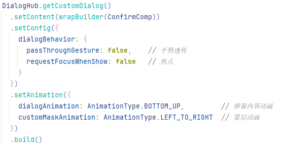 “DialogHub”提供了多種配置選項(xiàng)解決彈窗的交互問題。例如,通過setConfig接口的passThroughGesture屬性解決手勢透傳問題;requestFocusWhenShow屬性解決焦點(diǎn)搶占問題;通過setAnimation接口的customMaskAnimation解決遮罩動(dòng)畫自定義的問題: