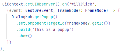 “DialogHub”支持UI解耦的彈窗能力。例如,在全局監(jiān)聽里創(chuàng)建彈窗(以氣泡彈窗為例),通過鏈?zhǔn)秸{(diào)用的方式綁定目標(biāo)組件并彈出:
