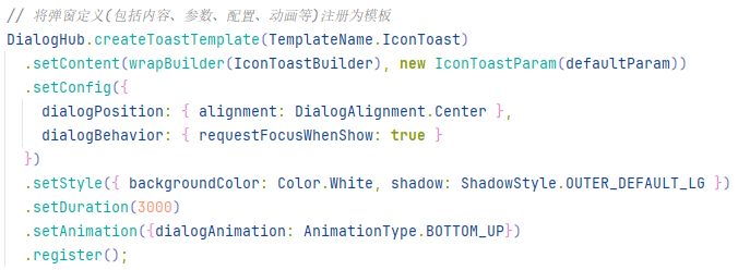 步驟一:使用“DialogHub”的createToastTemplate、register接口創(chuàng)建一個(gè)符合UX定義的消息提示框模板: