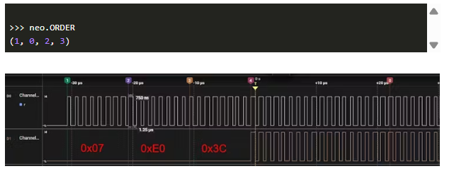 使用neoI處理數(shù)組的前三個元素,并傳遞紅色,綠色和藍(lán)色,0xe0, 0x07和0x3c的值。在內(nèi)部,這使得私有函數(shù)setitem()。這些值以改變后的順序輸入緩沖區(qū)。正如我們將看到的曲線,這是我在邏輯分析儀的幫助下記錄的。這些值是在緩沖區(qū)中發(fā)送的。一個0對應(yīng)于一個近似的窄脈沖。500NS寬度后面跟著a)。這些值以改變后的順序輸入緩沖區(qū)。正如我們將看到的曲線,這是我在邏輯分析儀的幫助下記錄的。這些值是在緩沖區(qū)中發(fā)送的。一個0對應(yīng)于一個近似的窄脈沖。500NS寬度后面跟著a)。這些值以改變后的順序輸入緩沖區(qū)。正如我們將看到的曲線,這是我在邏輯分析儀的幫助下記錄的。這些值是在緩沖區(qū)中發(fā)送的。一個0對應(yīng)于一個近似的窄脈沖。500NS的寬度按交換順序發(fā)送。這與數(shù)據(jù)表中的信息相對應(yīng),也可以通過以下方式進(jìn)行驗(yàn)證。