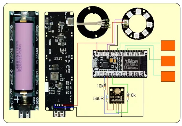 我們將LED環(huán)的信號線連接到GPIO13上。戒指有8個led,同樣你也可以使用一個有12個led的戒指。當(dāng)然,它也會更快地耗盡電池。使用8系列環(huán),電流消耗在40mA到250ma之間。當(dāng)使用2200毫安時,根據(jù)亮度設(shè)置的不同,負(fù)載足夠使用大約8小時。