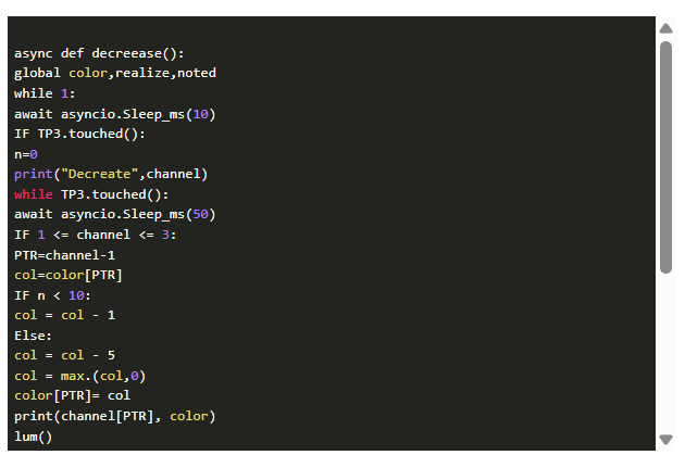 我們想用三個傳感器板來控制新led。通過GPIO33的觸摸板進(jìn)行顏色選擇。有五個通道:開/關(guān)、紅、綠、藍(lán)和明/暗。強(qiáng)度增加到GPIO32,降低到GPIO27。這三個活動的操作在后臺以三個函數(shù)并行運(yùn)行。這是通過asyncio模塊實(shí)現(xiàn)的。