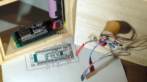 作為能源供應(yīng),我選擇了18650型的鋰離子電池,加上一個帶有加載部分和5V輸出的電池所有者。我在USB A插座的連接旋轉(zhuǎn)上焊接了我的電路的供應(yīng)線。這樣我就不用USB插頭了,仍然可以使用板上的機(jī)械開關(guān)。它將指向房屋朝向地面,以及在圖2中板子上端的加載插座。
