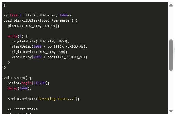 然后使用xTaskCreate()創(chuàng)建兩個任務(wù),它有幾個參數(shù):任務(wù)函數(shù):由任務(wù)執(zhí)行的函數(shù)(blinkLED1Task或blinkLED2Task)任務(wù)名稱:用于調(diào)試目的的描述性名稱堆棧大?。簽槿蝿?wù)堆棧分配的內(nèi)存(以字節(jié)為單位)(這里是2048字節(jié))任務(wù)參數(shù):傳遞給任務(wù)的數(shù)據(jù)(NULL表示沒有參數(shù))任務(wù)優(yōu)先級:從0到24的數(shù)字,其中更高的數(shù)字意味著更高的優(yōu)先級;任務(wù)句柄:存儲任務(wù)句柄的指針,用于以后的管理