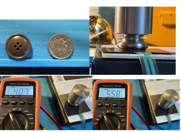 我們將一枚10美分硬幣和一枚直徑相同的縫紉紐扣放在重物下進(jìn)行測(cè)試——由于它們的重量分布不同,它們的讀數(shù)也不同!