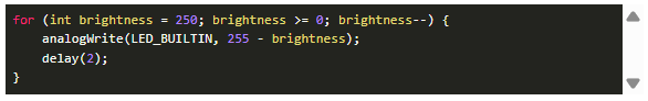循環(huán)開始時亮度設置為250,在之前的狀態(tài)下,LED是開的。只要亮度大于等于0,循環(huán)就會繼續(xù)。在每次迭代中,亮度降低1(從250→249→248…添加2毫秒的延遲以創(chuàng)建平滑的衰落效果,而不是瞬間變化。