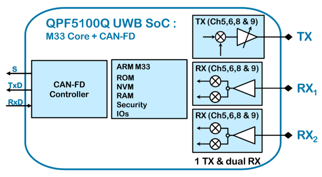 傳統(tǒng)UWB解決方案通常需要外接射頻前端、安全芯片與處理器,增加了開發(fā)周期和成本。QPF5100Q通過采用“All-in-One”設(shè)計(jì),進(jìn)而解決了這一難題。配備最高達(dá)2 MB的嵌入式閃存(eFlash NVM)及最高達(dá)256 KB的SRAM,QPF5100Q能夠處理復(fù)雜算法、實(shí)時(shí)數(shù)據(jù)交換及頻繁的數(shù)據(jù)存儲與檢索等任務(wù)。同時(shí),它還集成了CAN FD控制器、多路高速/低速SPI、I2C、UART、PWM等多種外設(shè)接口,僅需單芯片即可替代傳統(tǒng)方案中“MCU+射頻模塊+安全芯片”的復(fù)雜組合,這不僅簡化了設(shè)計(jì)流程,減少了技術(shù)障礙,還大幅縮短了產(chǎn)品從概念到市場的轉(zhuǎn)化時(shí)間。