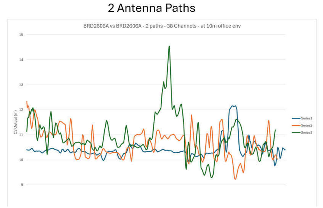 下面的測試是在辦公室環(huán)境中進(jìn)行的,這種環(huán)境會產(chǎn)生反射和多徑干擾。測試是使用BRD2606進(jìn)行的,但每個開發(fā)板僅使用一根天線,從而形成一條天線路徑。