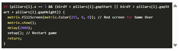 這將檢查小鳥是否擊中了柱子(在間隙之外),并顯示紅色的“Game Over”,然后重新開始游戲。