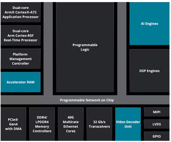 這些設(shè)備結(jié)合了多種處理元素,包括Arm Cortex-A72應(yīng)用處理器、實時Cortex-R5F處理器、可編程邏輯和專用AI引擎。所有這些組件都通過高帶寬、低延遲的片上網(wǎng)絡(luò)(NoC)相互連接,從而實現(xiàn)高效的數(shù)據(jù)移動和跨異構(gòu)計算結(jié)構(gòu)的緊密集成。
